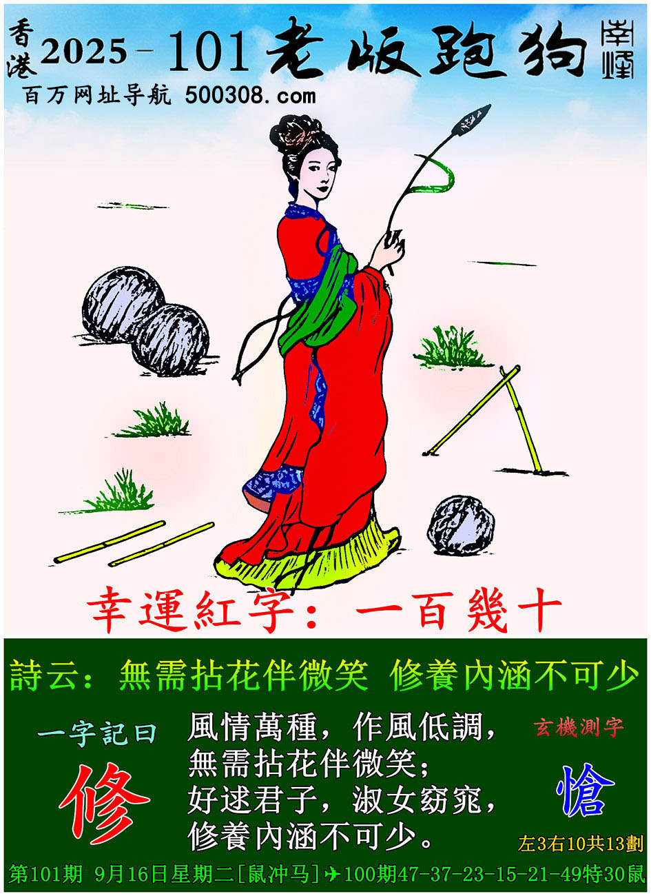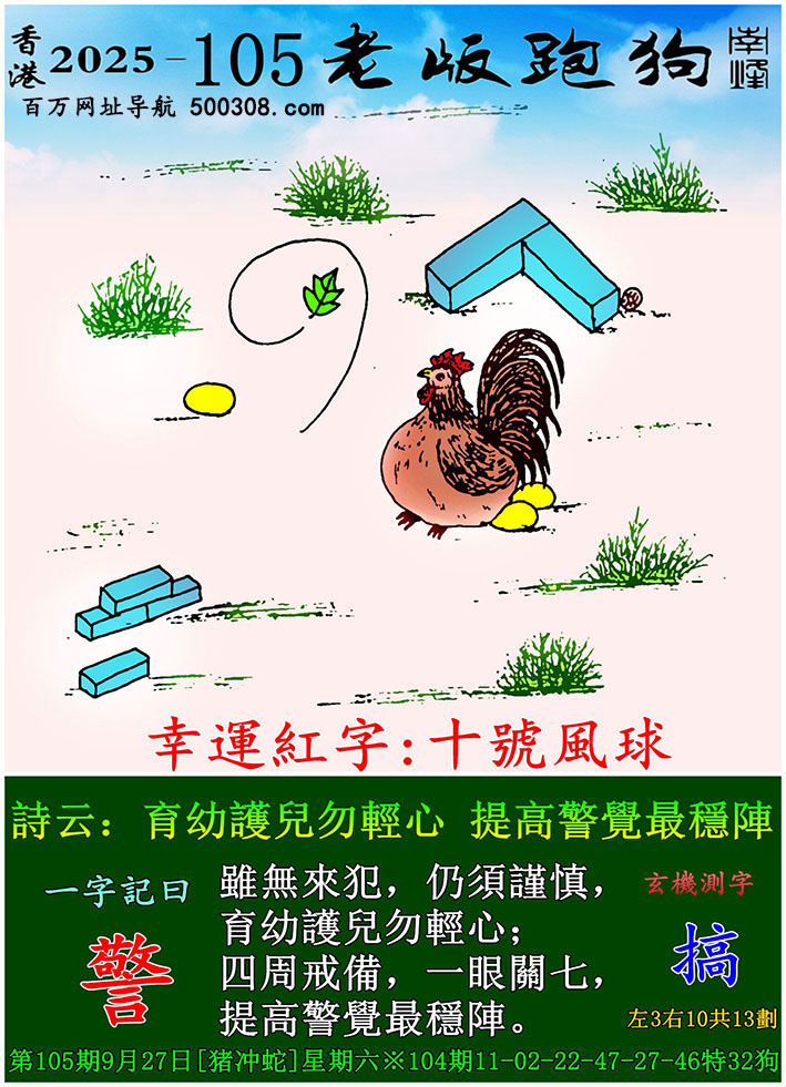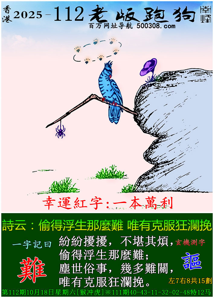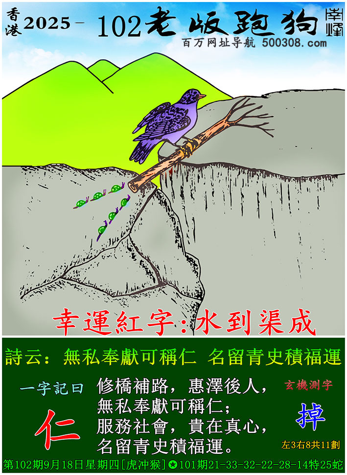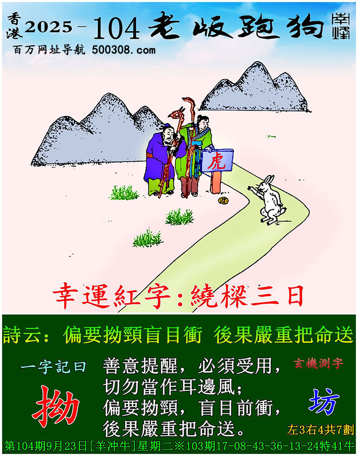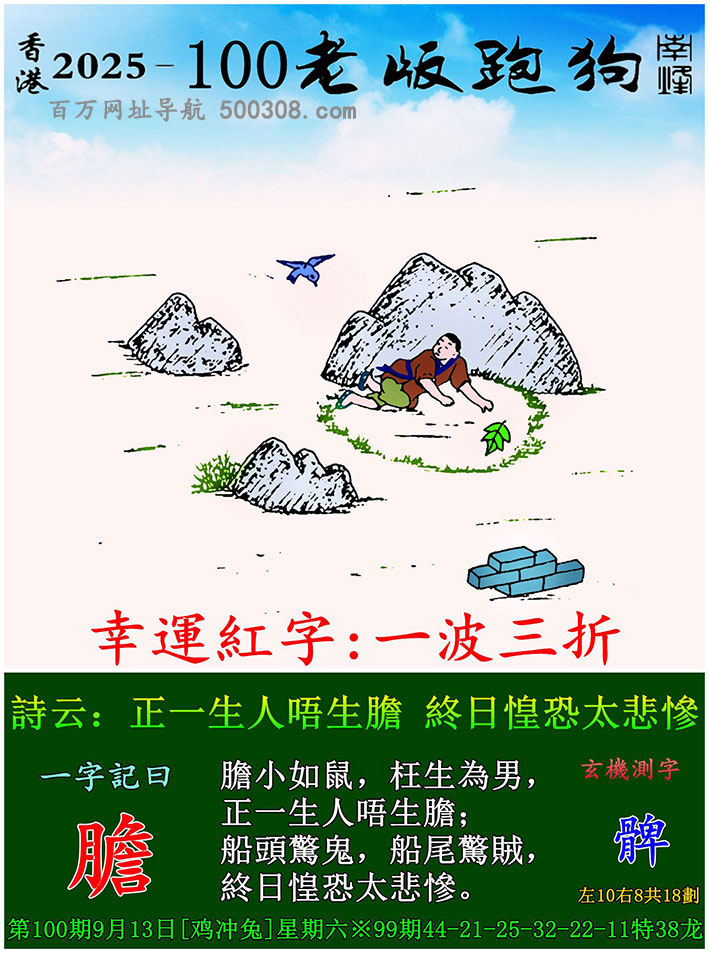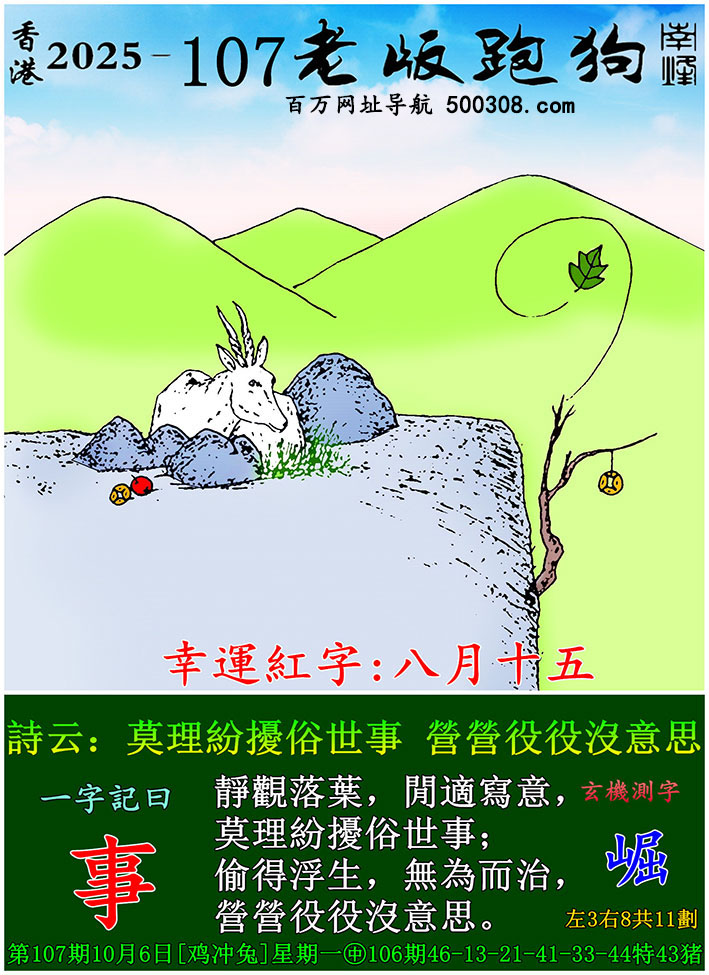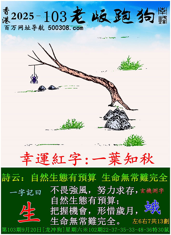 109期跑狗图:一字記之曰:【裂】 裂縫藏身,餐風飲塵。 嫩枝斜出,探頭食取。玄機測字:《踐》 一語中特:三番四次