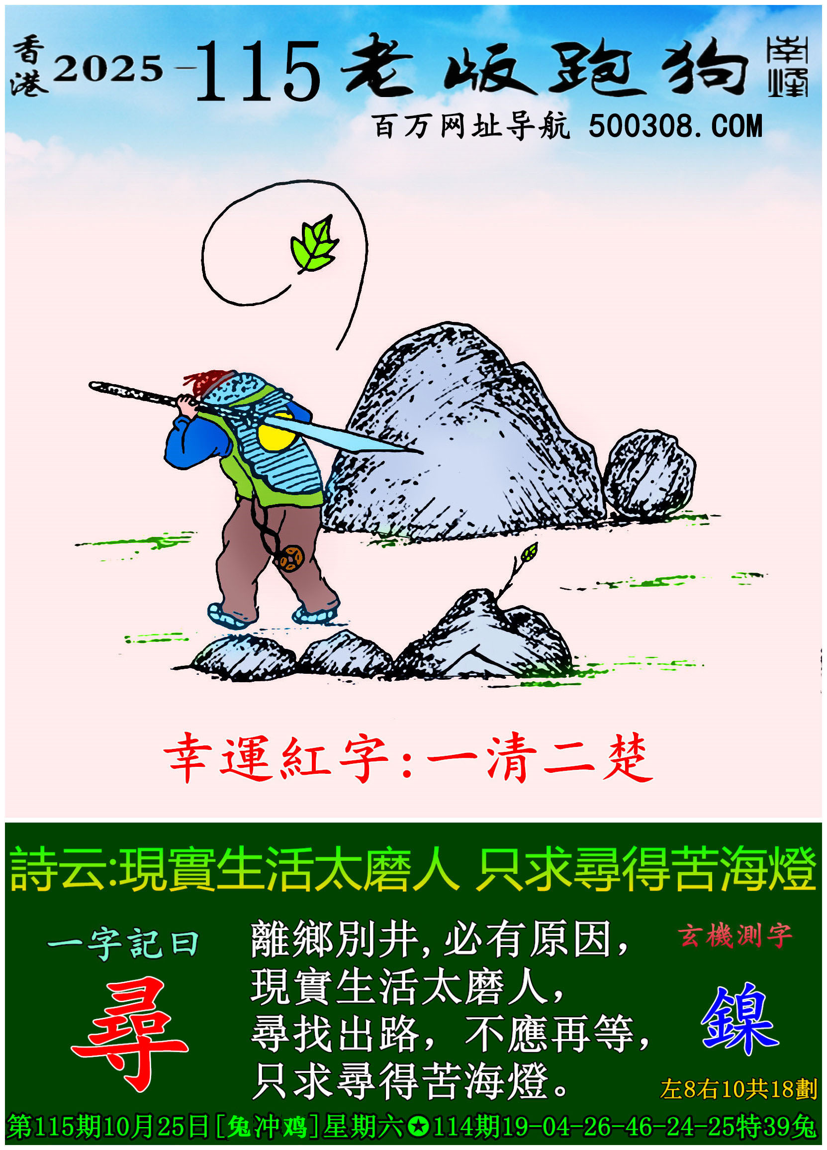 115期跑狗图:一字記之曰: 【旗】 旗映殘陽,血染征裳。 不破樓蘭,誓不還鄉。玄機測字:《權》 一語中特:九死一生