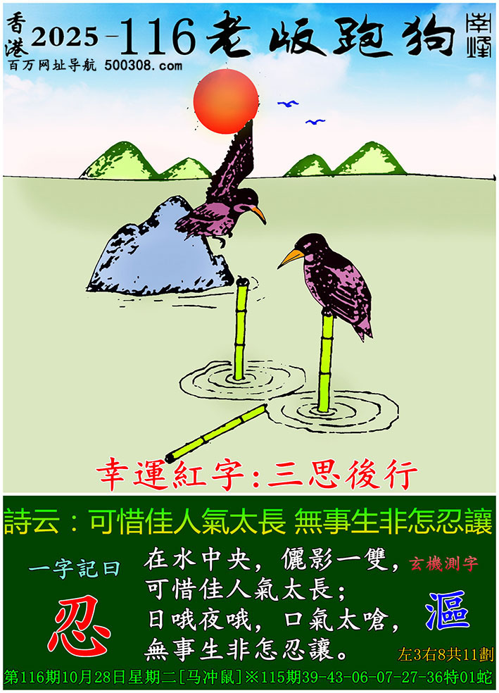 113期跑狗图:一字記之曰:【照】 晨光初照,金鋪碧浪。 溪喧石上,鷗逐霞光。 玄機測字:《軒》一語中特:二人三足